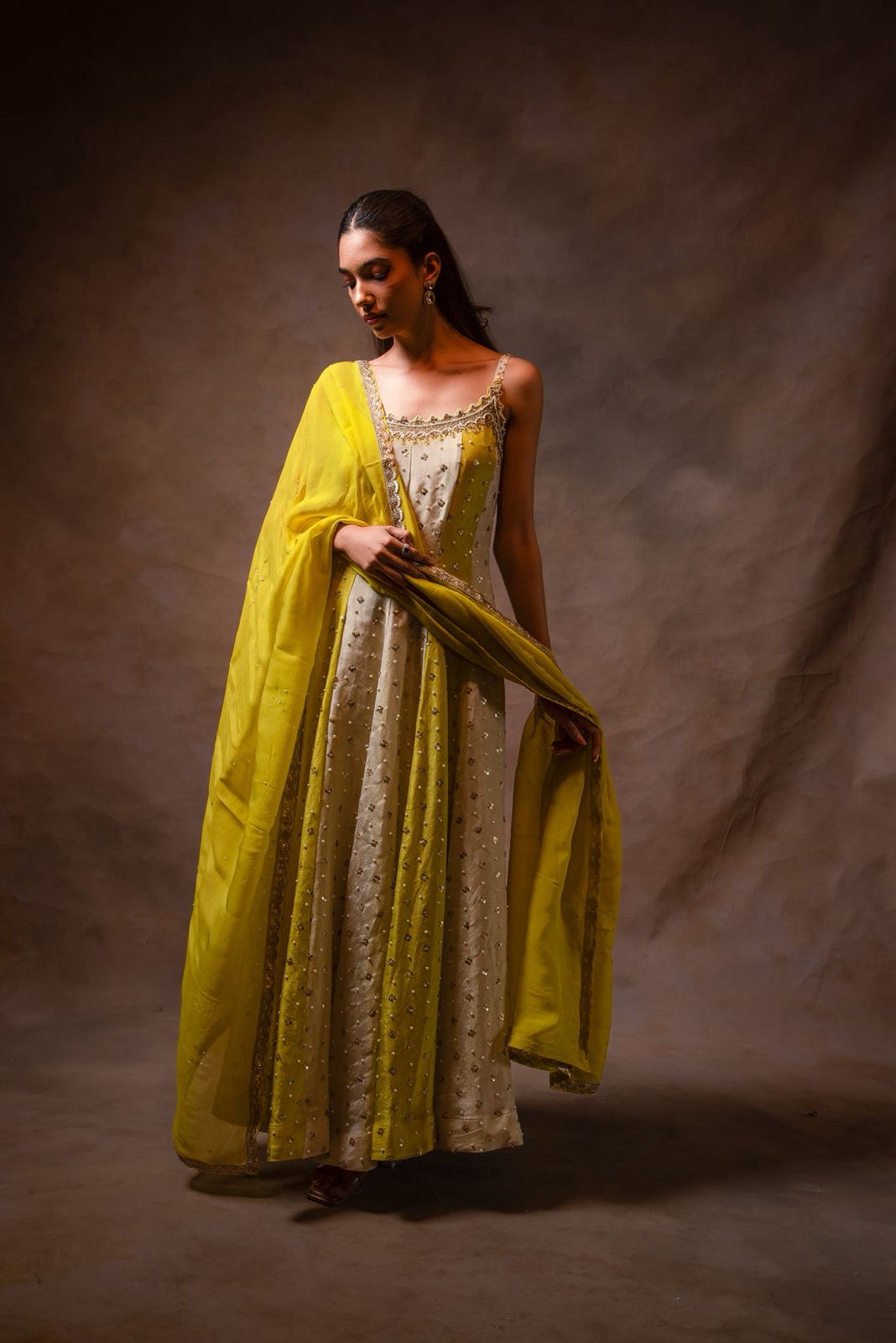 Elevate your ethnic wardrobe with this exquisite Anarkali, meticulously crafted with intricate handwork and ornamental mirrors that catch light beautifully. The luxurious satin crape fabric drapes elegantly in warm yellow and beige tones, creating a sophisticated color palette perfect for festive occasions and celebrations. Each piece showcases artisanal detailing that reflects traditional craftsmanship, ensuring you stand out with timeless grace and refined elegance.