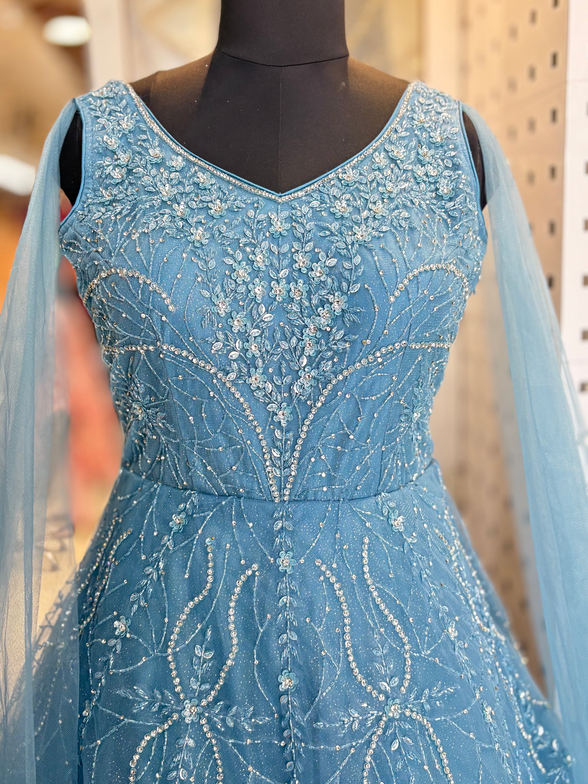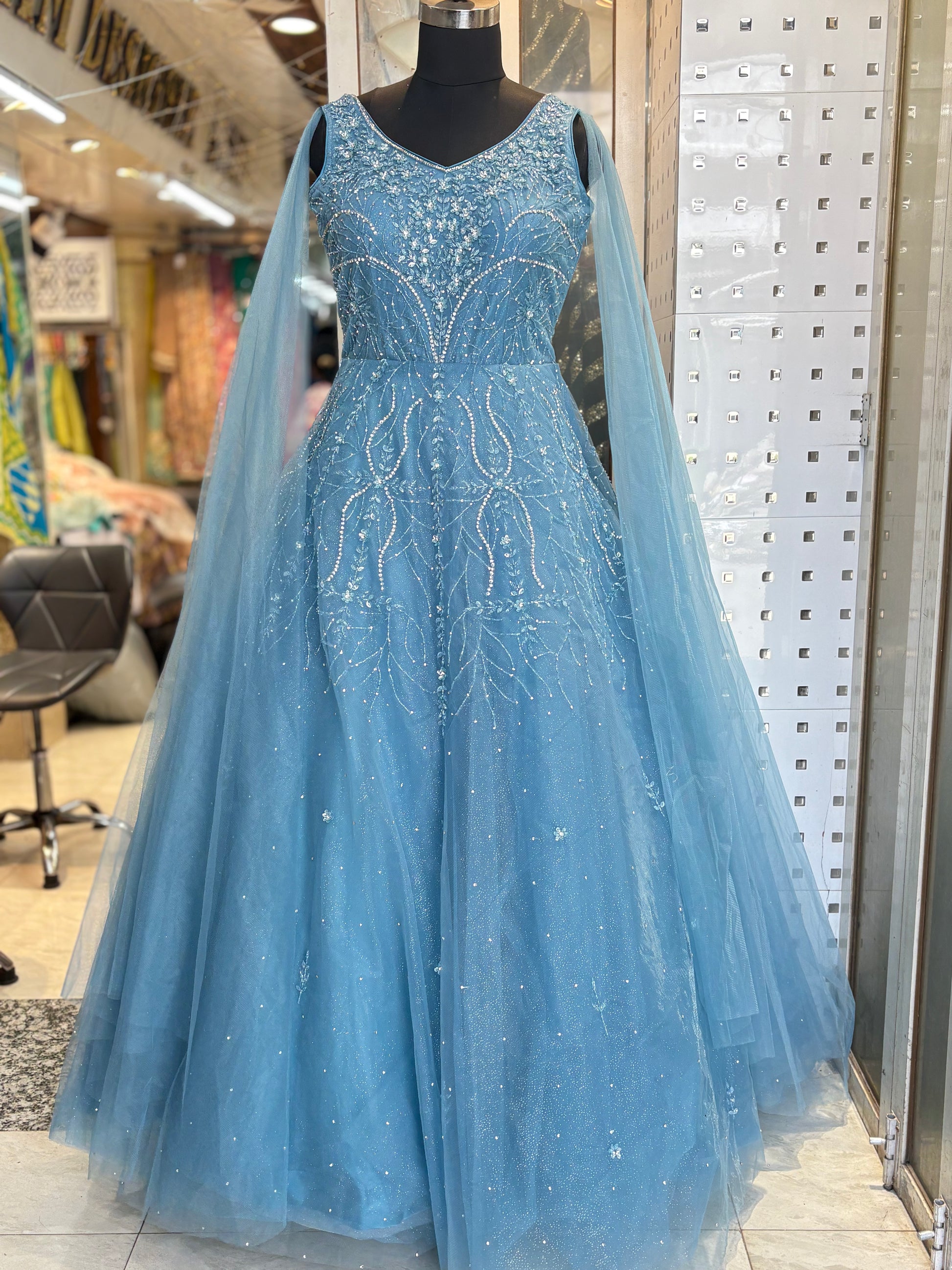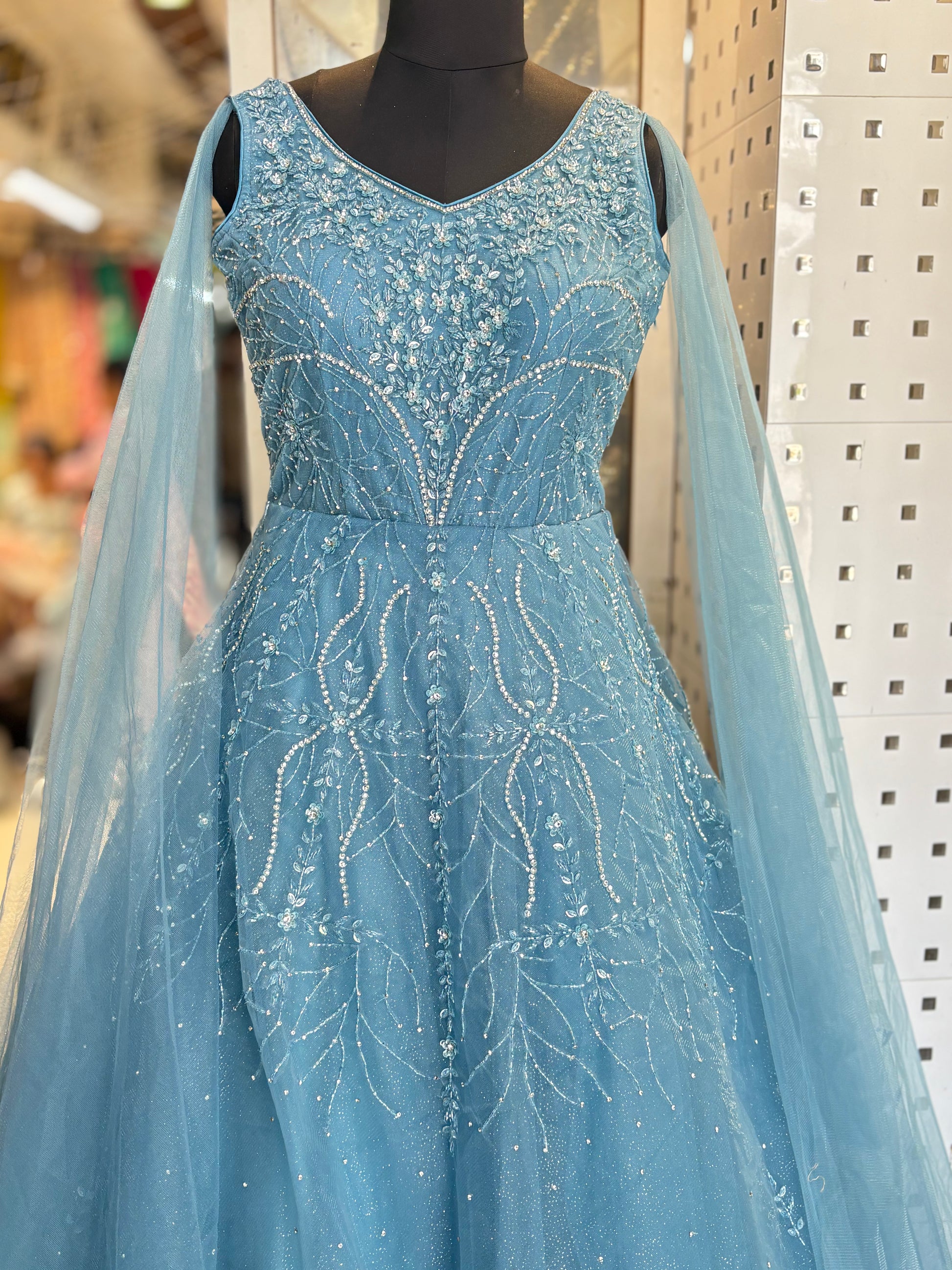 Elevate your presence with this exquisite ball gown, meticulously crafted through traditional handwork techniques. Constructed from luxurious maharani net fabric, this piece showcases intricate artisanal detailing that captures light beautifully. The delicate net drapes elegantly, creating a sophisticated silhouette perfect for formal occasions and celebrations. Each stitch reflects expert craftsmanship, ensuring a garment that's both visually stunning and built to last. Ideal for those who appreciate fine tailoring and timeless elegance.