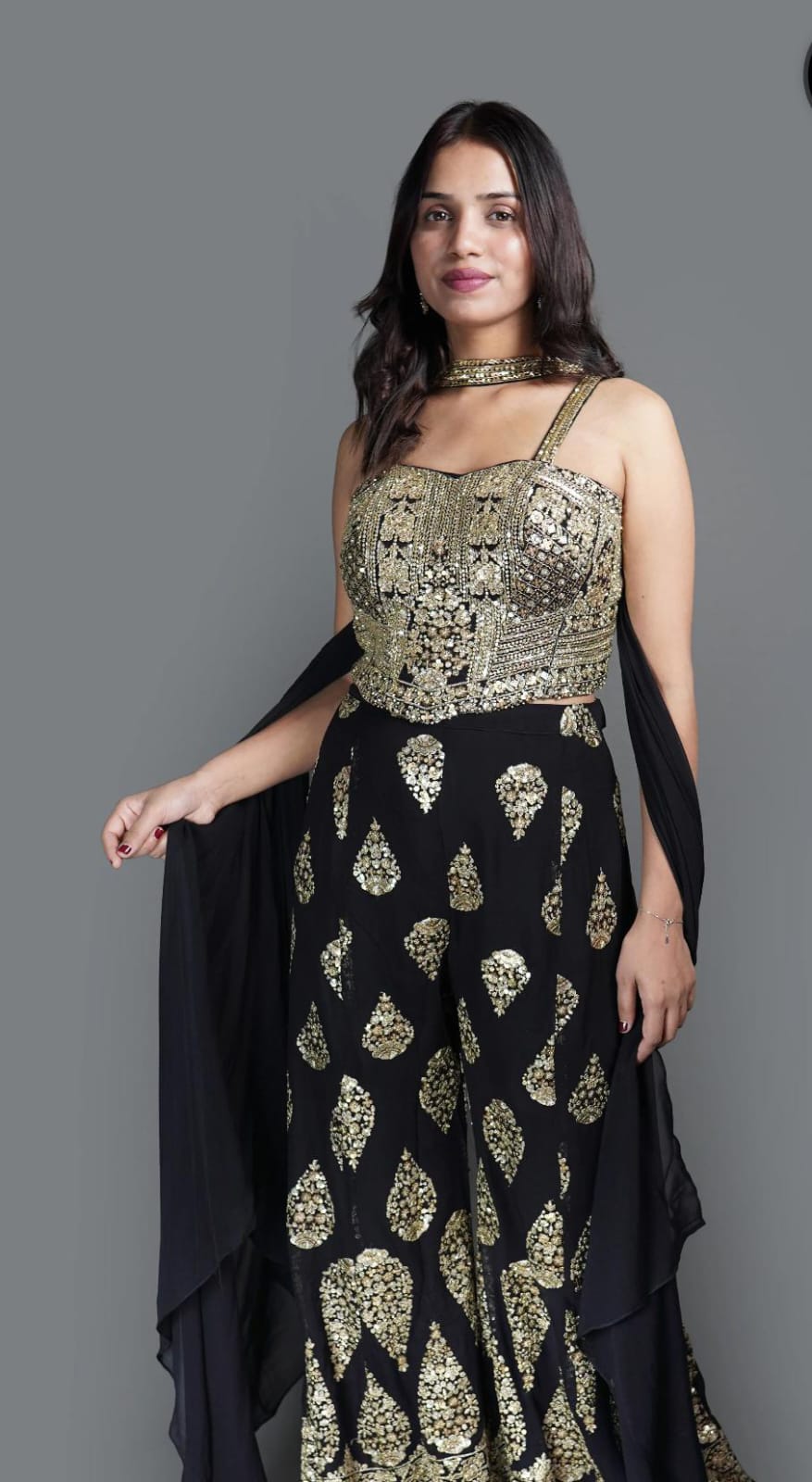 Elevate your ethnic ensemble with this exquisite cordset crop top paired with palazzo pants. Meticulously crafted with intricate stone and sequence embellishments, this piece showcases traditional artisanal detailing that commands attention. The fitted crop silhouette flatters while maintaining the grace of classic Indian wear, while the coordinating palazzo offers effortless comfort and movement. Perfect for festive occasions, celebrations, or when you seek to make a refined style statement. A contemporary take on timeless elegance.