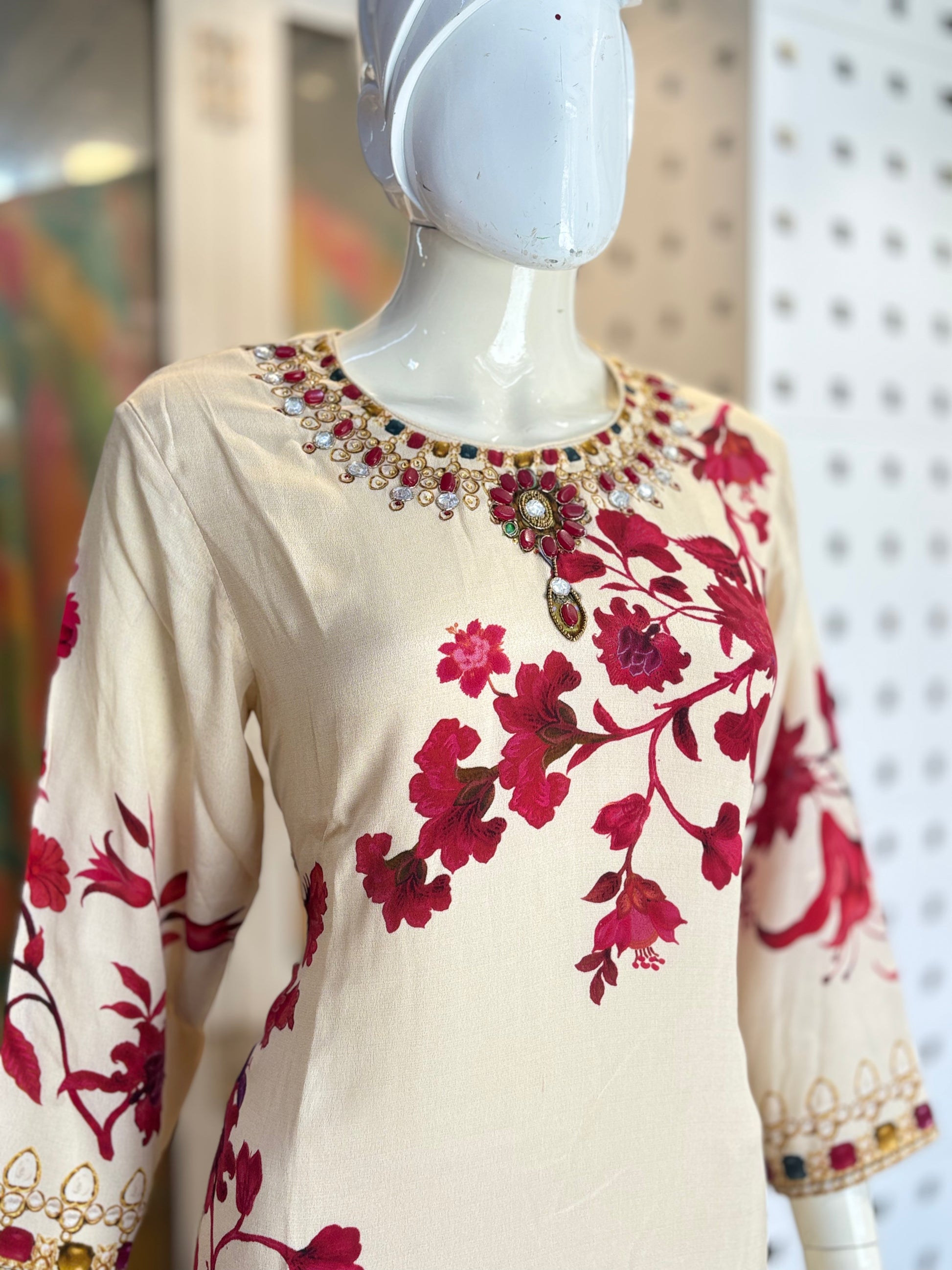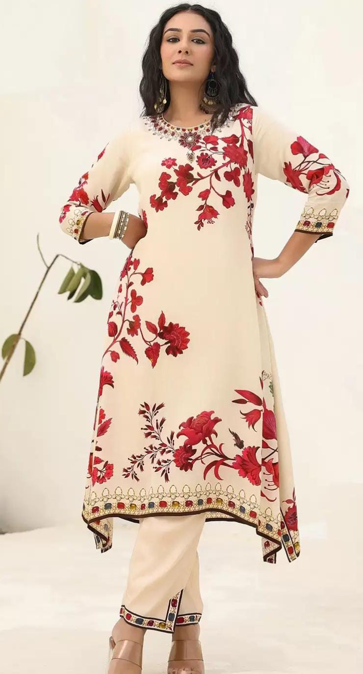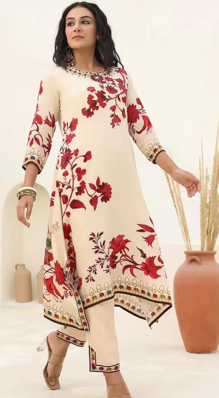 Crafted from pure crepe fabric, this piece features exquisite digital print detailing complemented by delicate handwork. The lightweight and breathable crepe ensures comfortable wear, while the intricate hand embellishments add a refined touch of artistry, elevating the garment's appeal with expert craftsmanship.