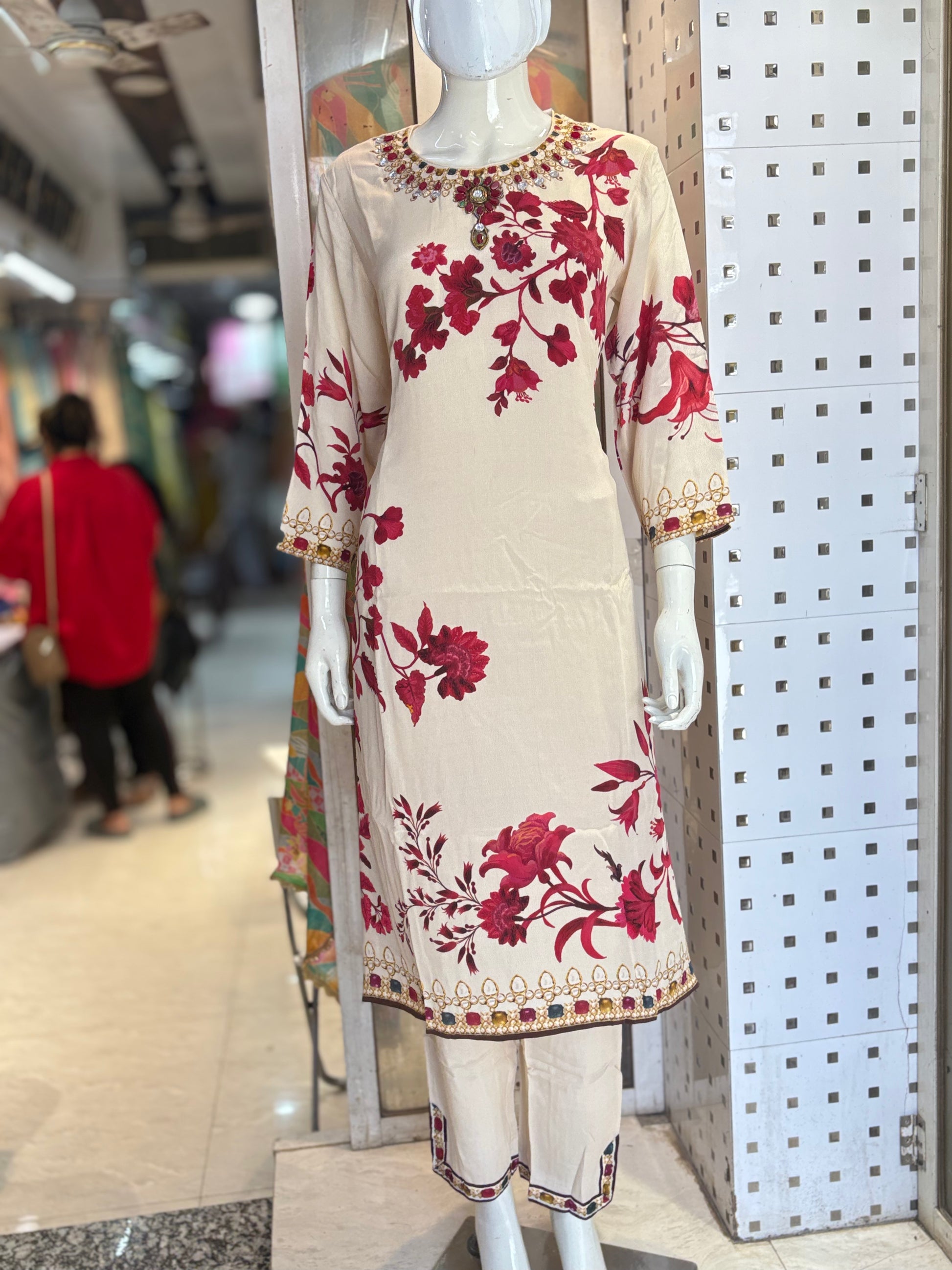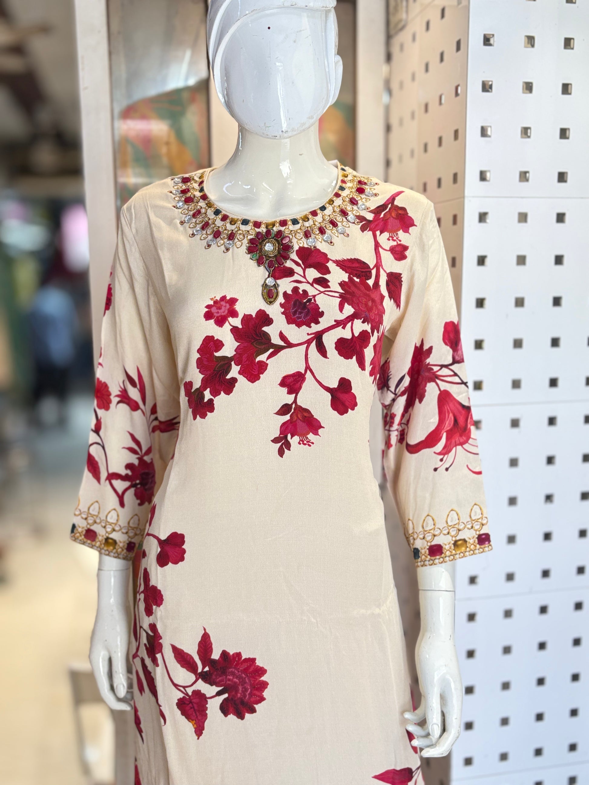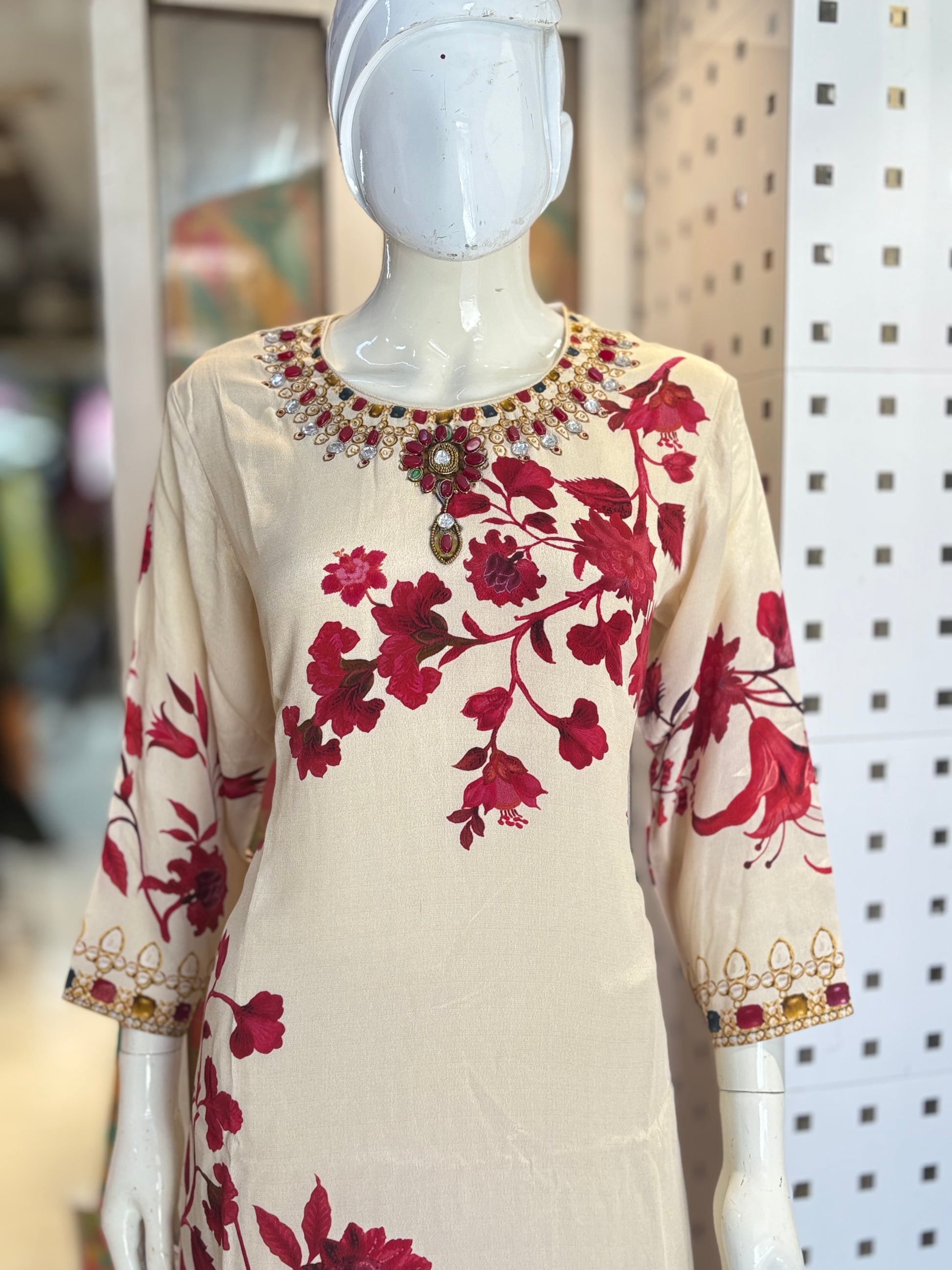 Crafted from pure crepe fabric, this piece features exquisite digital print detailing complemented by delicate handwork. The lightweight and breathable crepe ensures comfortable wear, while the intricate hand embellishments add a refined touch of artistry, elevating the garment's appeal with expert craftsmanship.