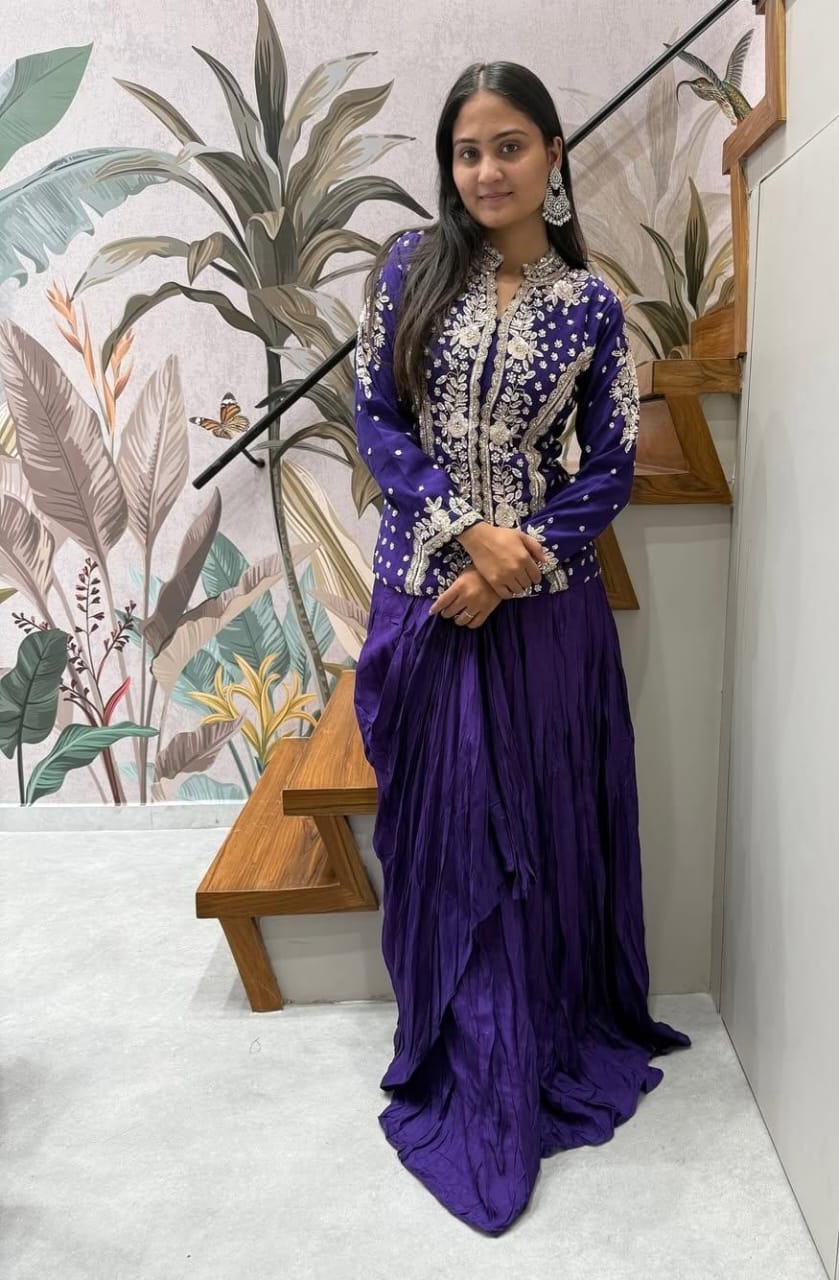 This Indo Western ensemble features a graceful crape fabric that ensures a smooth, elegant drape. The skirt flows effortlessly, creating a flattering silhouette, while the short top adds a contemporary edge to the traditional style. Perfectly blending comfort with sophistication, this outfit is ideal for festive occasions and stylish gatherings.