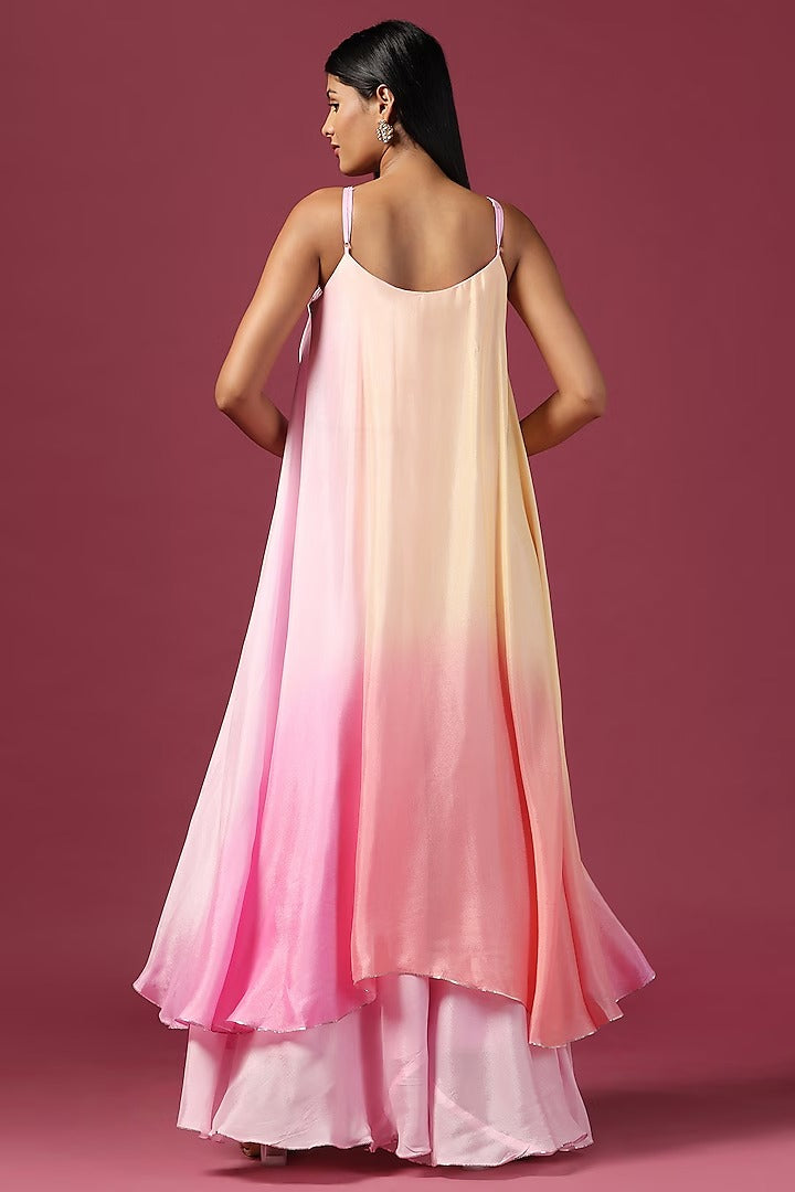 Elevate your cocktail ensemble with this stunning Indo-western high-low layered poncho paired with palazzo pants. Crafted with intricate stone and sequin embellishments, this piece showcases a mesmerizing blend of colorful and ombre shades that create visual depth and sophistication. The asymmetrical high-low silhouette offers contemporary flair while honoring traditional design sensibilities, making it ideal for upscale evening events, celebrations, and festive occasions. The layered construction provides elegant movement and dimension, while the embellished detailing catches light beautifully throughout the evening. Perfect for those seeking a fusion of modern style with ethnic charm.