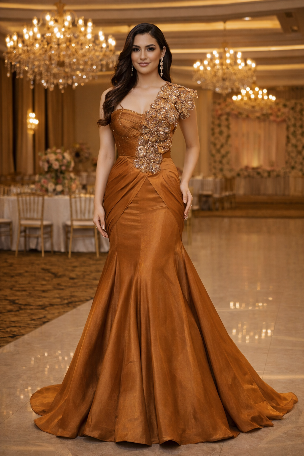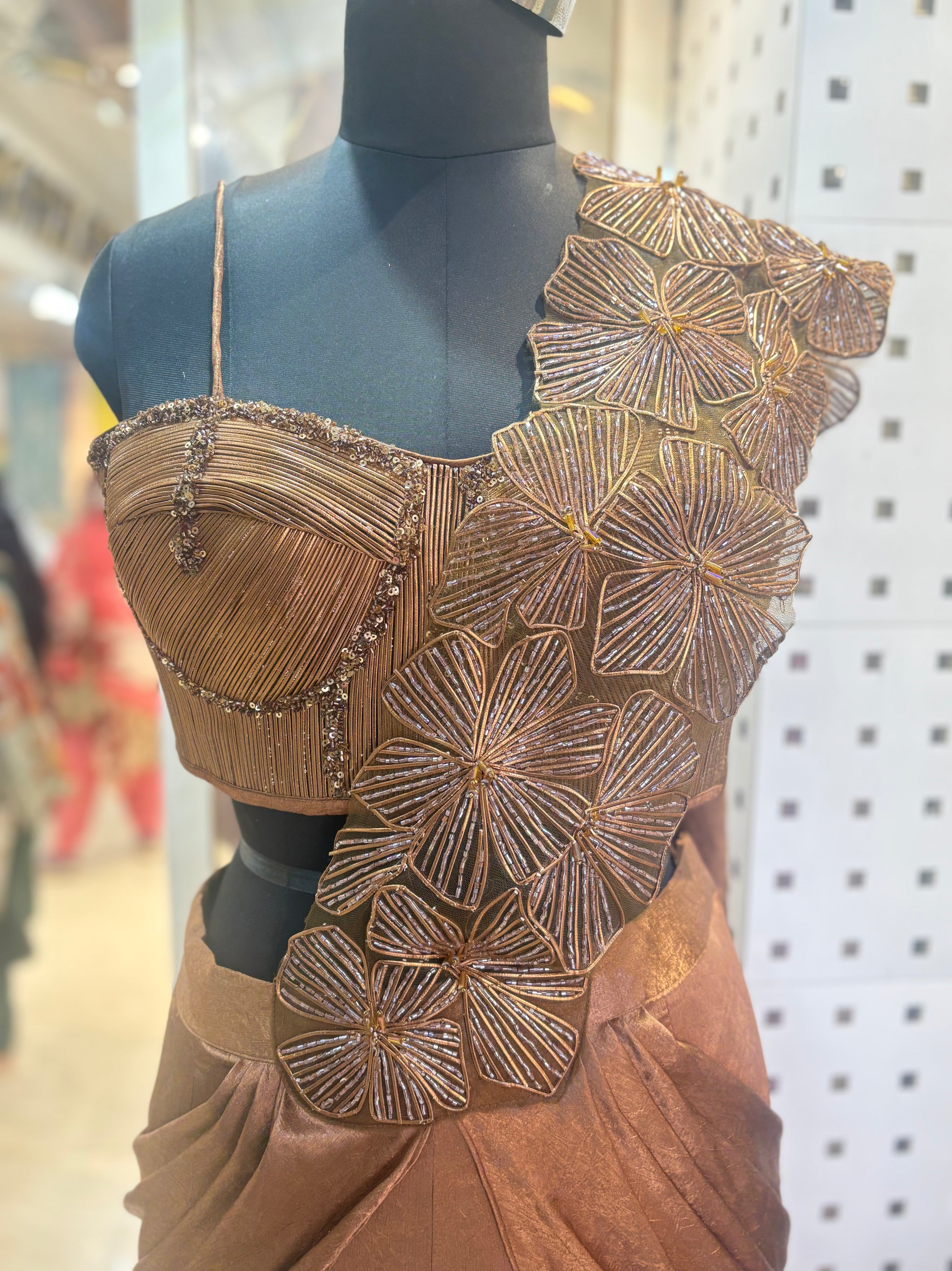 Elevate your evening ensemble with this stunning Indowestern cocktail outfit, meticulously crafted with intricate stone and sequin embellishments. The rich copper hue creates a warm, luxurious aesthetic that complements a range of skin tones and occasions. Each piece features expertly placed detailing that catches light beautifully, ensuring you command attention at any gathering. The fusion of traditional Indian craftsmanship with contemporary Western silhouettes makes this outfit versatile for cocktail parties, celebrations, and upscale events. Perfect for those seeking sophisticated style with cultural elegance.