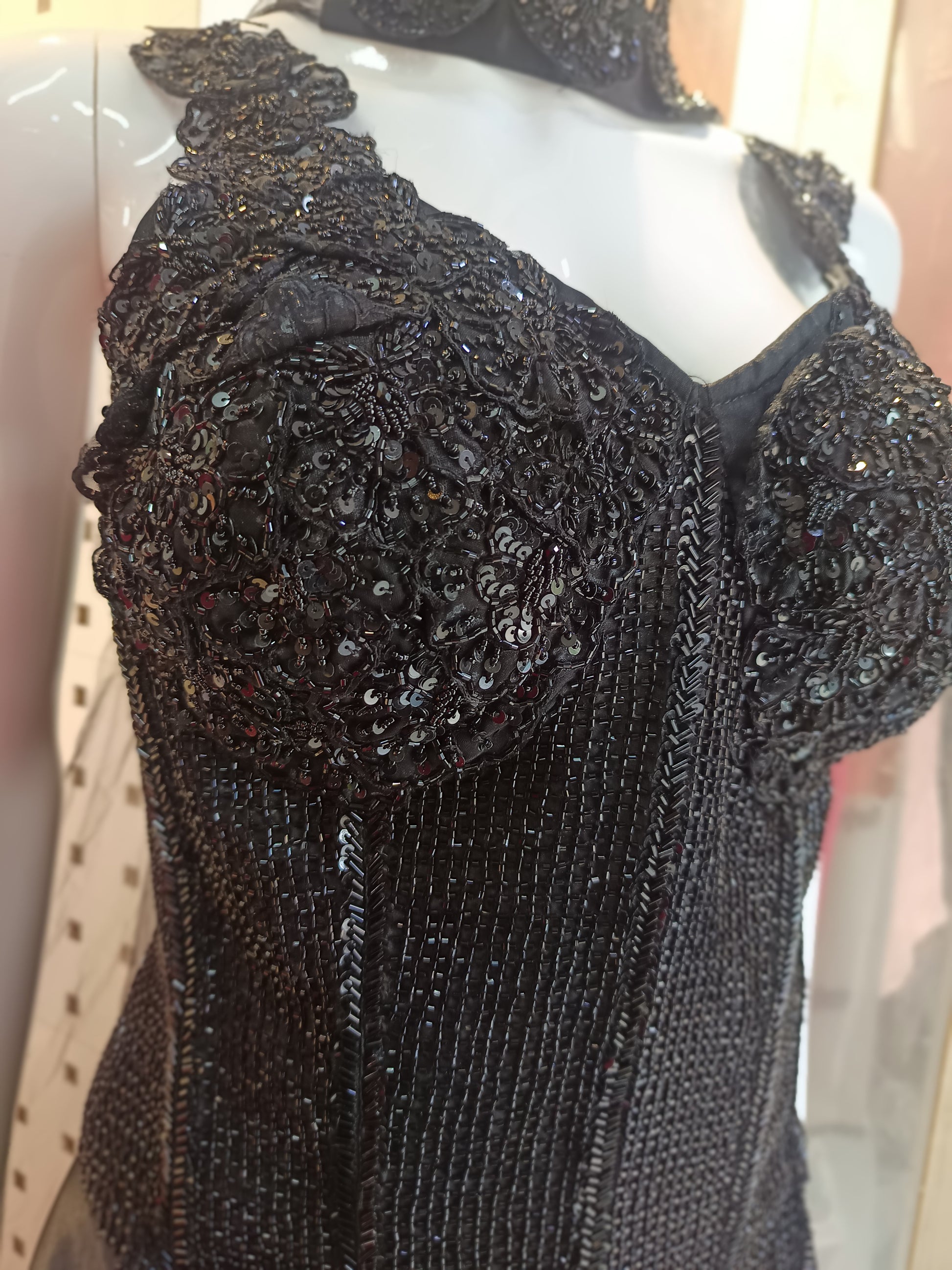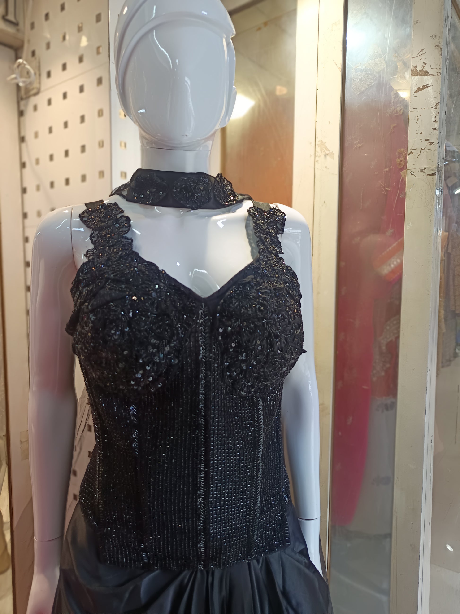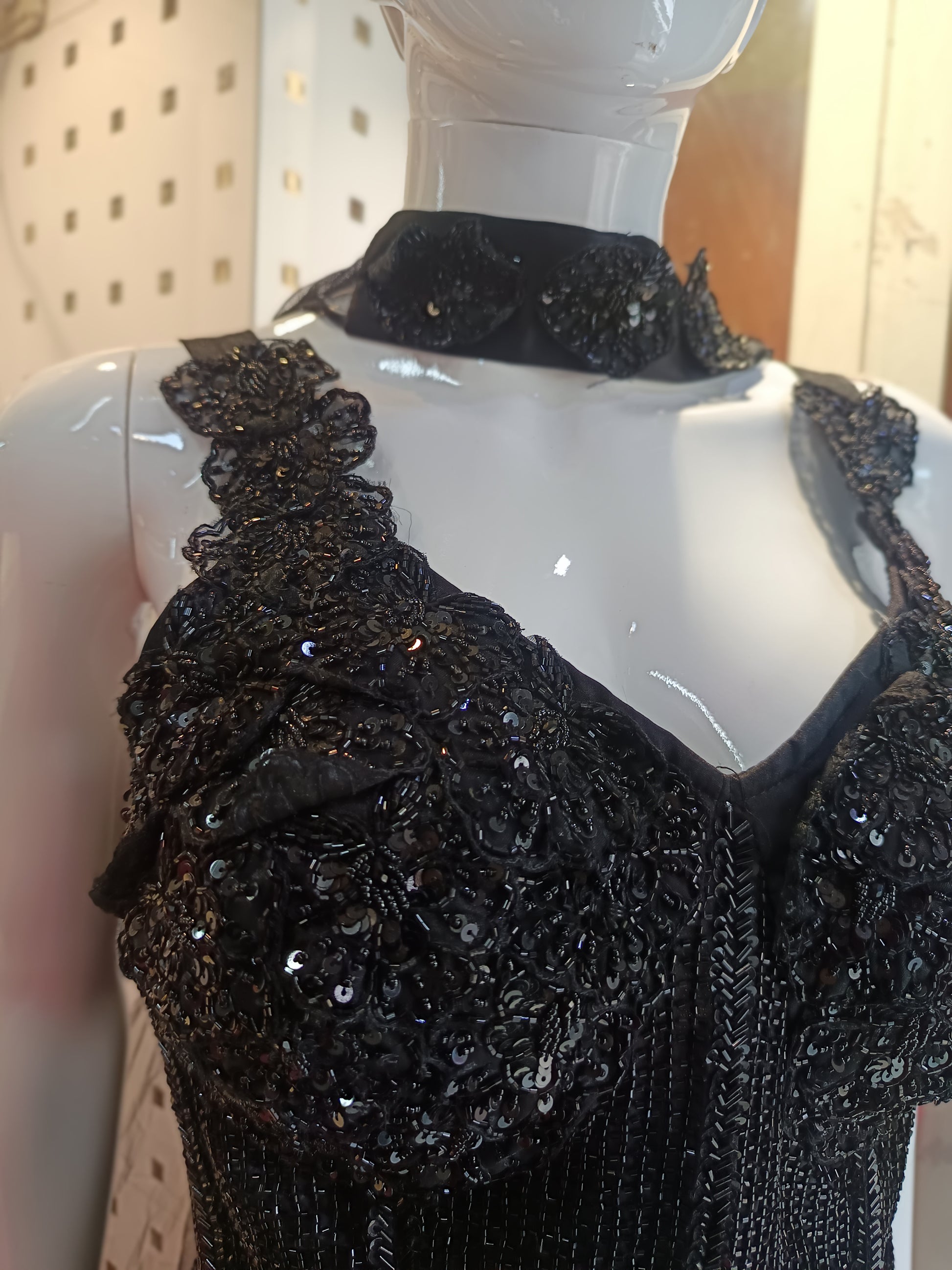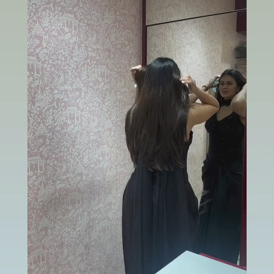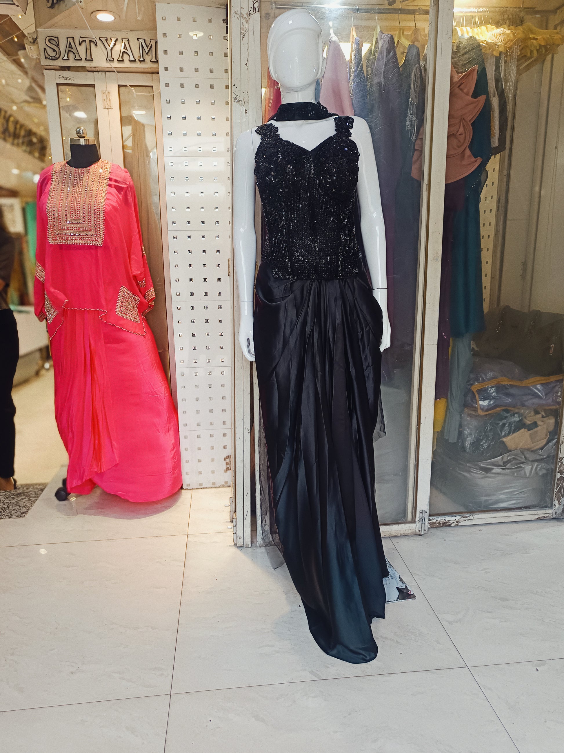 Elevate your ethnic wardrobe with this sophisticated Indo-Western drape skirt paired with an exquisite codeset top. Crafted from pure silk, this ensemble features intricate embellishments including traditional kardan work, delicate sequence detailing, and ornate cokar dupatta embroidery. The rich black color provides a timeless, versatile canvas that complements the detailed craftsmanship. Perfect for festive occasions, celebrations, or when you desire an elegant fusion of contemporary silhouettes with traditional Indian artistry. This piece seamlessly blends cultural heritage with modern style sensibilities.