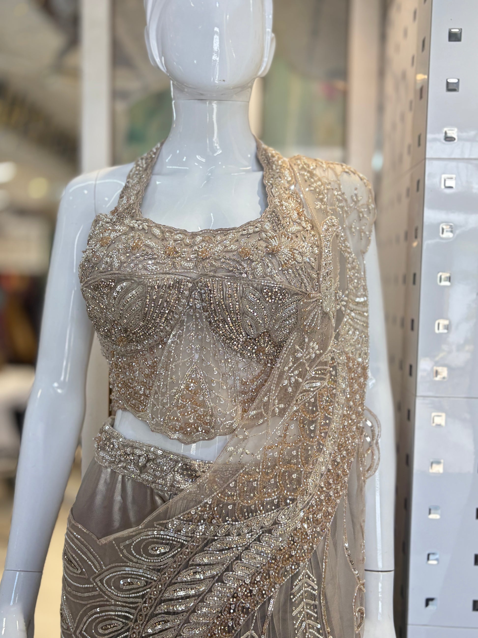 Crafted with meticulous handwork on luxurious satin crepe fabric, this Indowestern lehenga choli showcases an elegant nude gold hue. Its refined texture and subtle sheen make it perfect for festive occasions, ensuring you stand out with grace and sophistication. The blend of traditional craftsmanship with contemporary design offers both comfort and style in one exquisite ensemble.