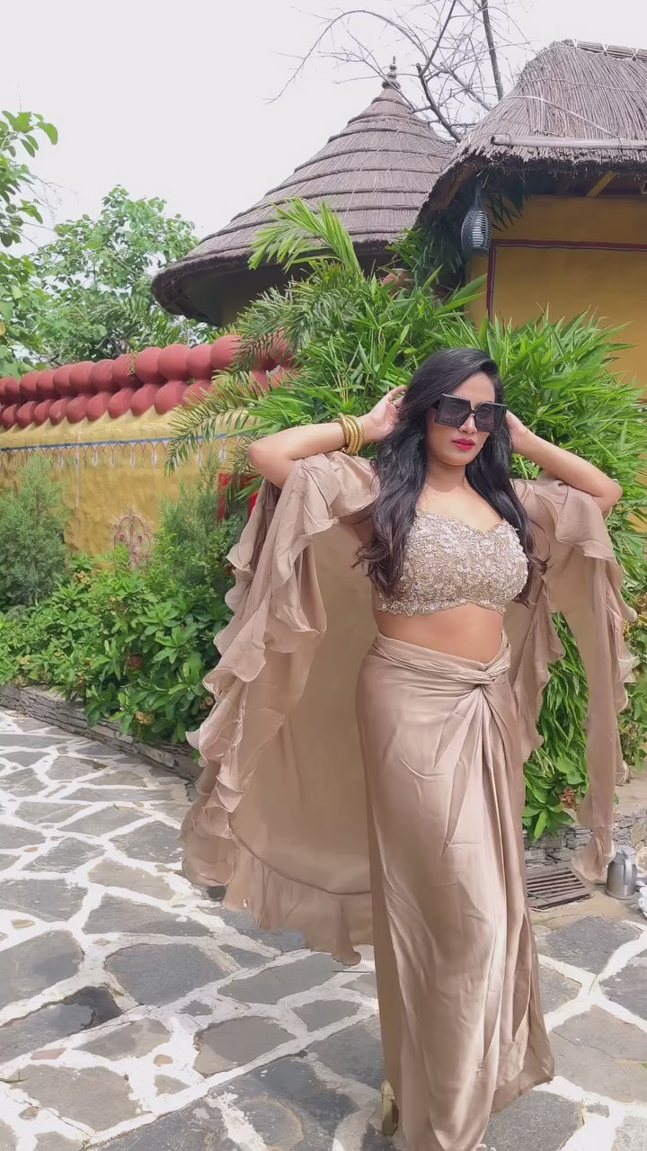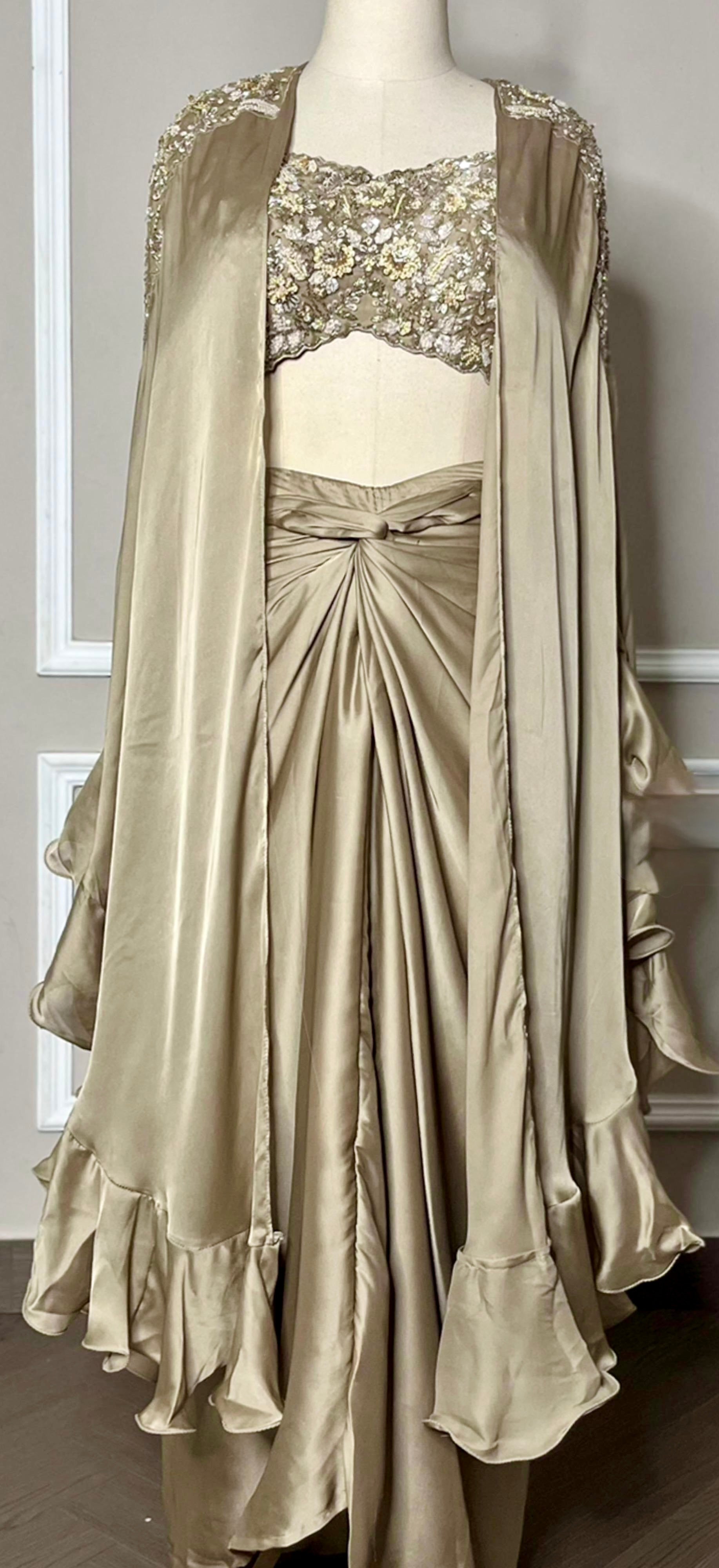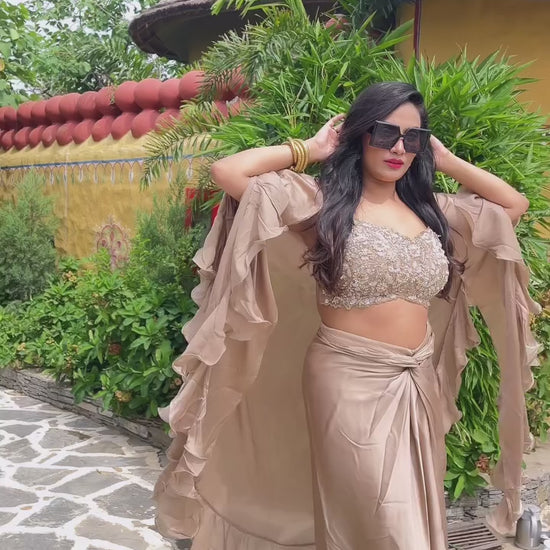 Experience the perfect blend of tradition and modernity with the Italiano Indo Fusion from our Luminous Collection. This elegant ensemble features a flowing skirt in luxurious satin crepe, complemented by a delicately embellished cape and a soft satin crepe crop top. Designed for festive occasions and evening events, it offers refined style with a contemporary edge, ensuring you stand out with effortless grace.