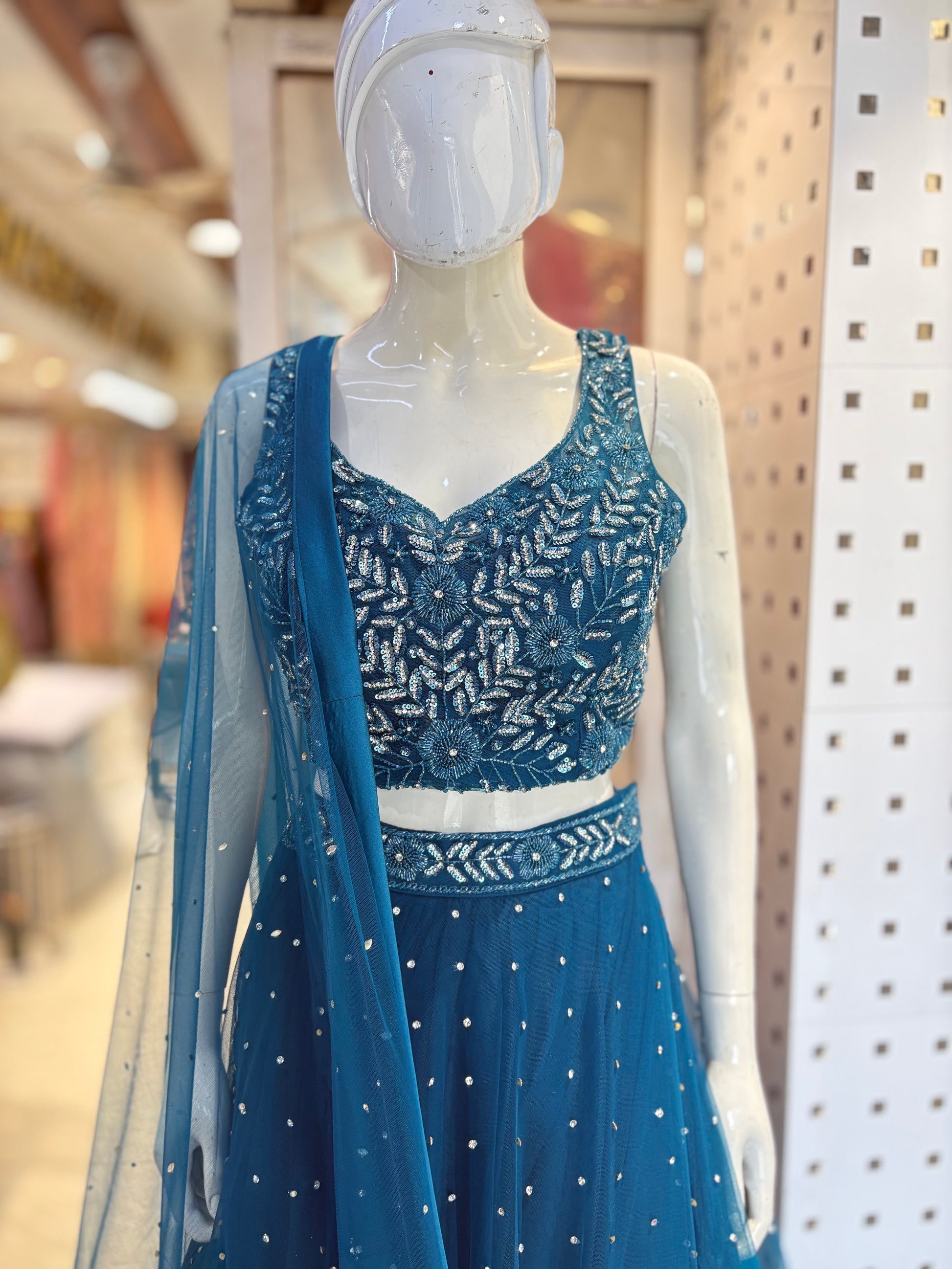 This lehenga choli features exquisite Maharani net fabric, known for its elegant texture and lightweight drape. The blouse is adorned with intricate handwork, adding a refined touch of craftsmanship and sophistication. Perfect for special occasions, this ensemble combines traditional artistry with luxurious fabric for a graceful and standout appearance.